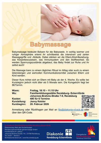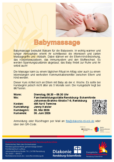 Die Kurse finden einmal wöchentlich in festen Kursblöcken statt, die Kursgebühr liegt bei 10€ pro Termin. Für unsere Kurse können sich Eltern mit Babys sowie Schwangere jederzeit anmelden. Je nach Geburtsdatum werden Kurse und Startdaten festgelegt. Anmeldung oder Rückfragen unter 04331/69 63-0, per E-Mail an fbs@diakonie-rd-eck.de oder über untenstehendes Formular.